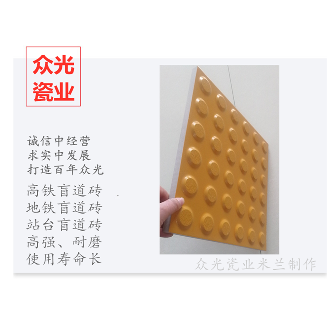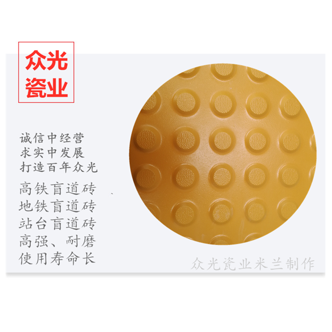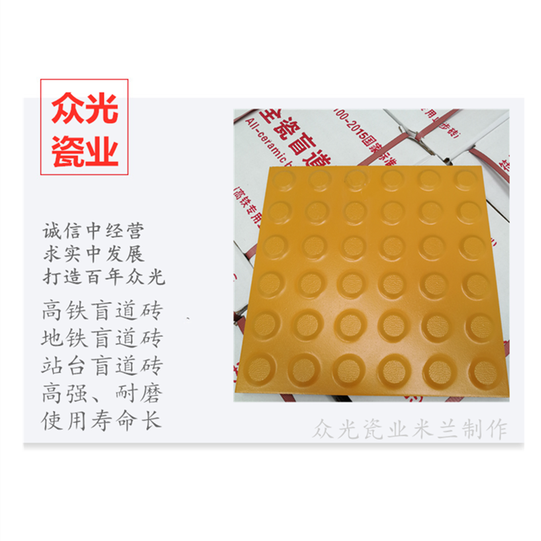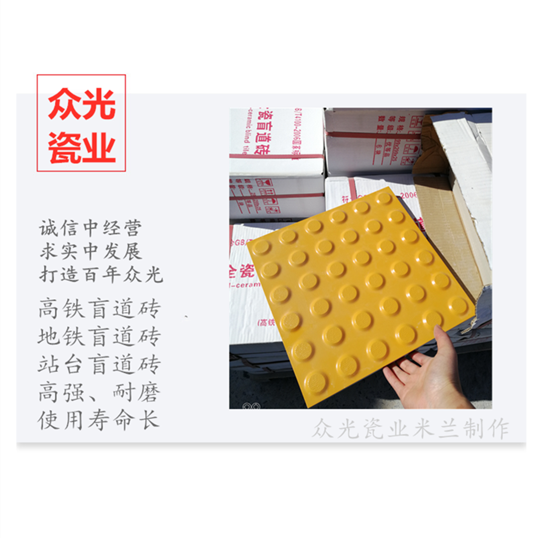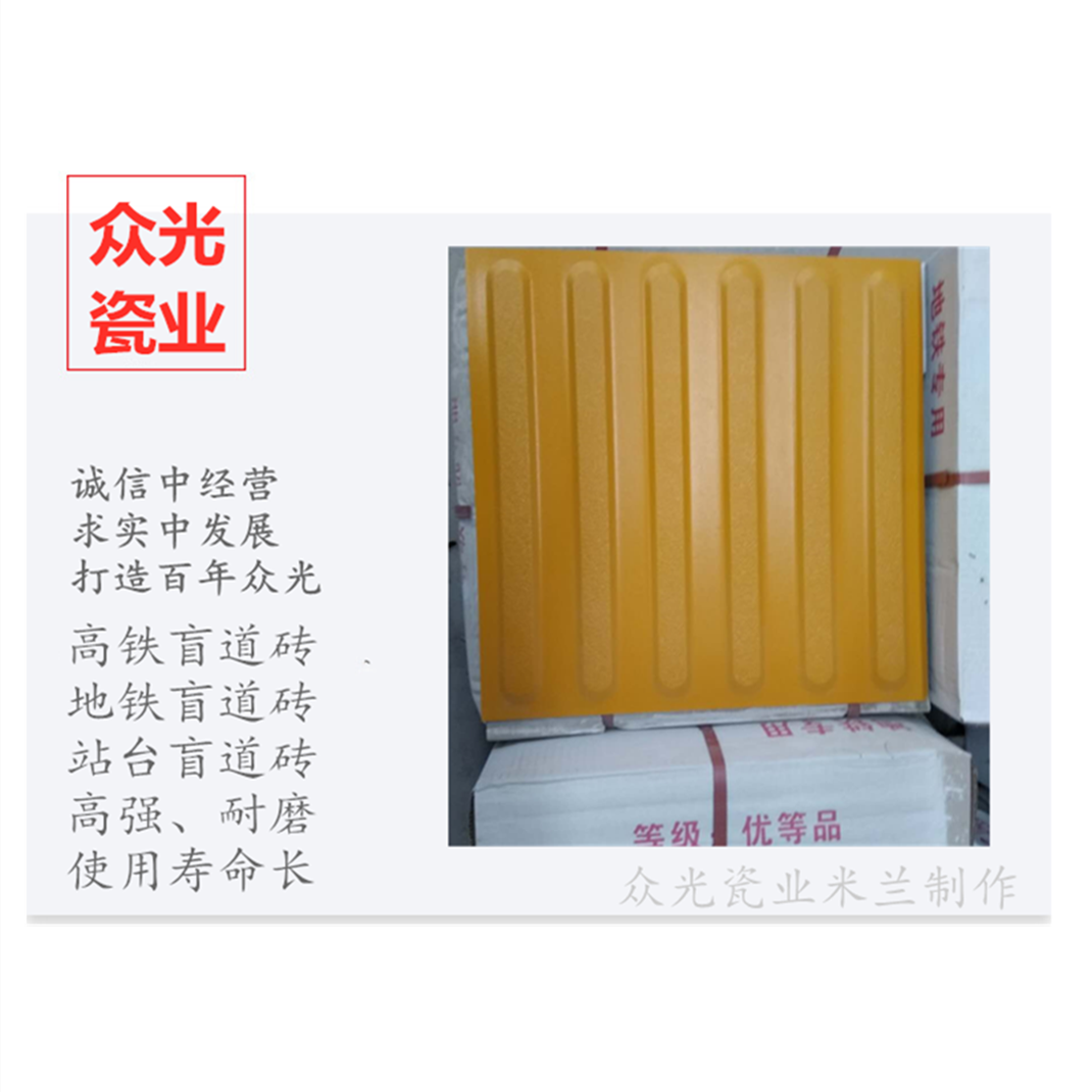 全瓷盲道磚生產(chǎn)廠家,焦作市眾光耐酸瓷業(yè)有限公司生產(chǎn)全瓷盲道磚,中黃盲道磚,耐磨,防滑,抗沖擊,色澤光鮮亮麗,適用于車站站臺